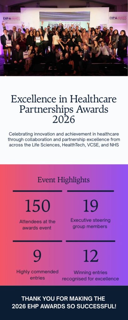 One week on, and we’re still beaming from ear to ear. As inaugural awards events go, this was a triumph – the numbers speak for themselves. Here at Visions4Health we are truly delighted with how the Excellence in Healthcare Partnership Awards (EHP Awards) night unfolded, but also super proud of all the effort, in partnership with PMGroup Worldwide, that happened behind the scenes to bring this fabulous event to life.
